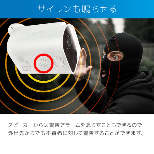 カメラにスピーカーとマイクを搭載。外出先から宅配業者へ指示したり、不審者に対してサイレンを鳴らすなど、アプリ越しにその場の状況へ対応できます。