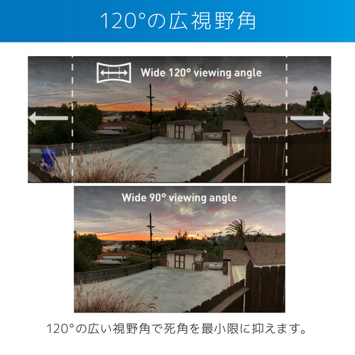 120度の広視野角で死角を抑え、暗くなると自動で暗視モードへ切り替わります。夜間でも人物や物体を鮮明に把握できます。