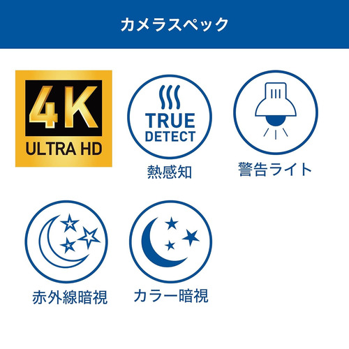 カラー暗視機能、PIRセンサー/物体温度感知センサー:35m、あり(センサー範囲:10m)/あり(True Detect)