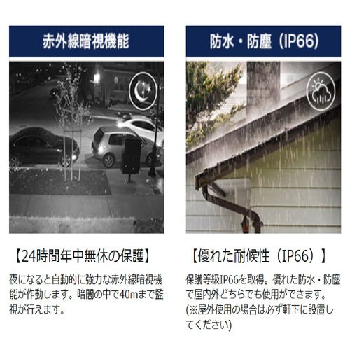 IP66の防塵防水の保護等級を取得。屋外仕様の場合はできるだけ軒下に設置してください。
