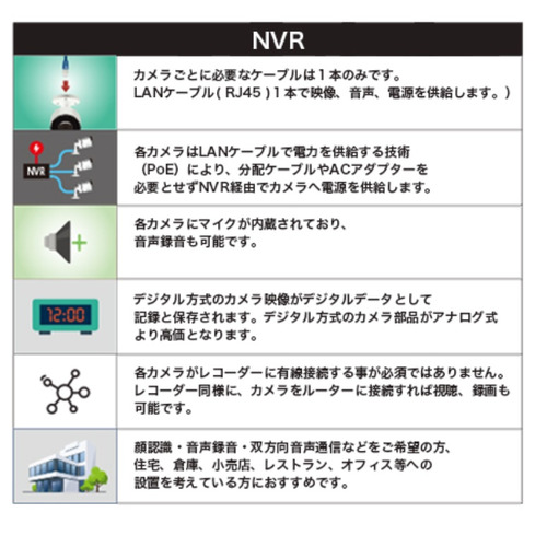NVRシステム、有線接続となりますので常時録画が可能です。工事が必要となります。倉庫、事業所、事務所、テナントに適しています。