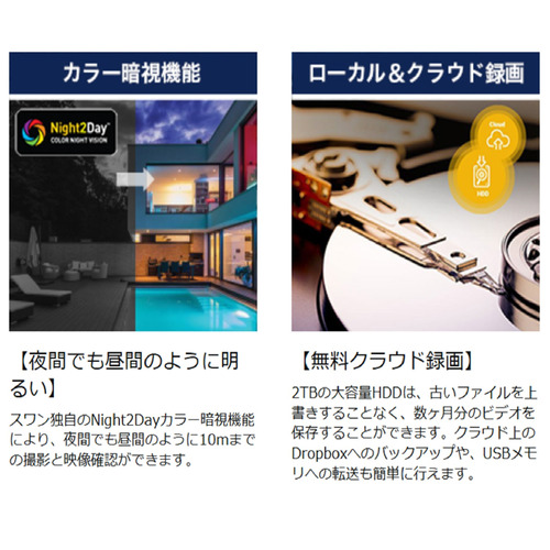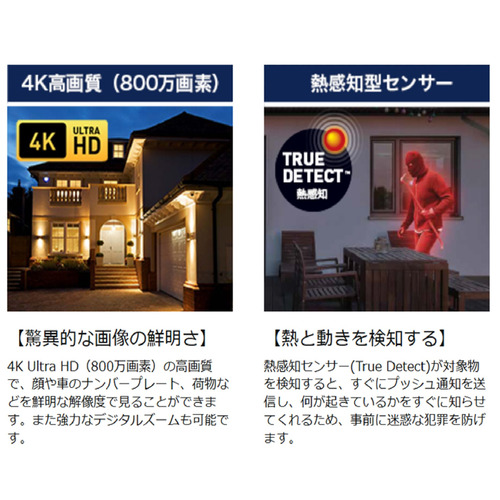 カラー暗視機能、PIRセンサー/物体温度感知センサー:35m、あり(センサー範囲:10m)/あり(True Detect)