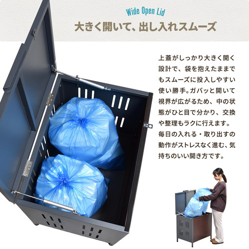 ガス圧ダンパーで片手で軽々開き、重いゴミ袋も出し入れラクラク。