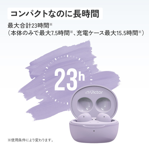 本体のみで最大7.5時間の連続再生、さらに充電ケースによるフル充電(最大15.5時間)と合わせると、最大23時間の長時間再生が可能です。