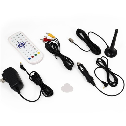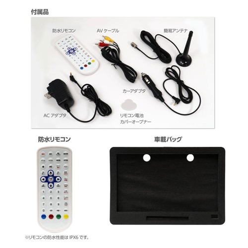 付属品:ACアダプタ (長約1.5m)、 AVケーブル (長約1.2m)、 車載用DCアダプタ (長約1.5m)、 車載用バッグ、取扱説明書、保証書、 B-CASカード、リモコン(動作テスト用電池付き CR2025)、 リモコン電池カバーオープナー