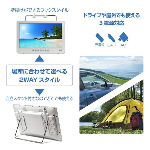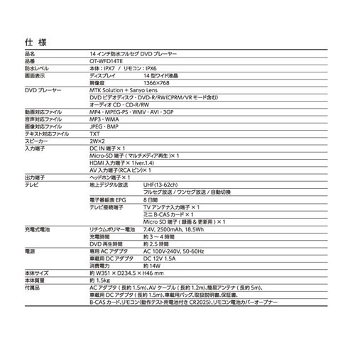 ダイアモンドヘッド OT-WFD14TE 14インチ防水フルセグDVDプレーヤー 地デジ・ワンセグ自動切替 地デジ番組録画機能搭載 ホワイト