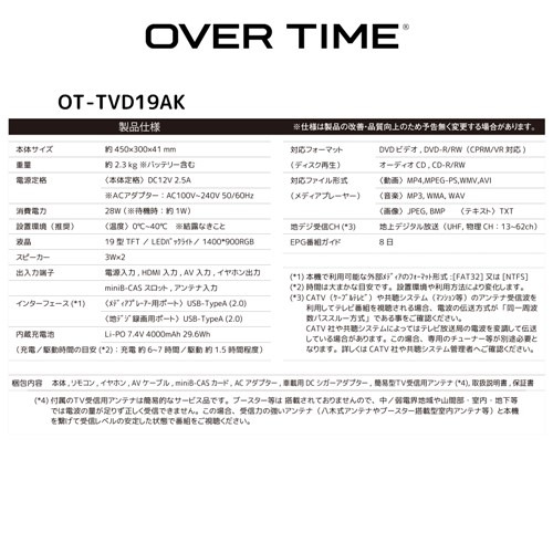 ダイアモンドヘッド OT-TVD19AK 19インチ 地デジチューナー搭載DVDプレイヤー 3電源対応 自立スタンド付