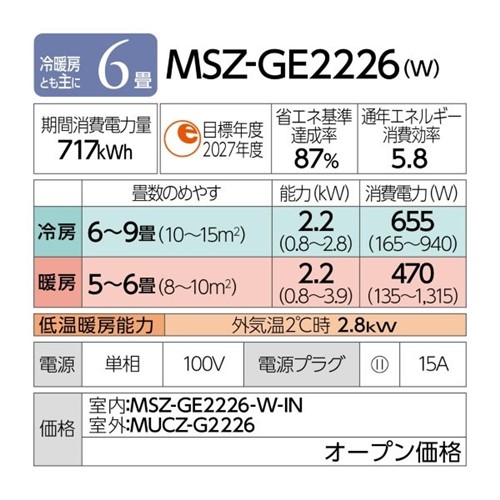 三菱電機 エアコン 6畳 霧ヶ峰GEシリーズ フロアアイ搭載 はずせるボディ 高温みまもり MSZ-GE2226-W ホワイト系 2026年モデル