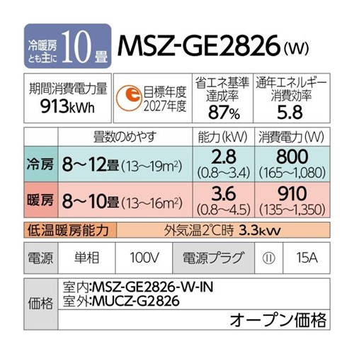 能力:【冷房】2.8(0.8〜3.4)KW【暖房】3.6(0.8〜4.5)KW