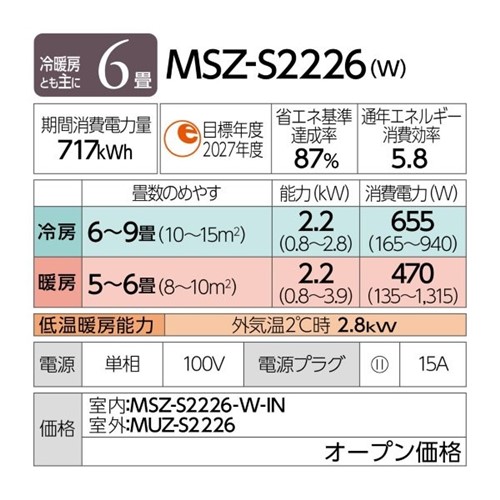 能力:【冷房】2.2(0.8〜2.8)KW【暖房】2.2(0.8〜3.9)KW