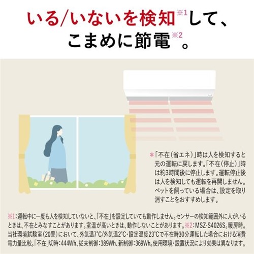 赤外線センサー「ムーブアイ」が人がいないことを検知すると、約3分で温度を抑えた弱めの運転に切替え