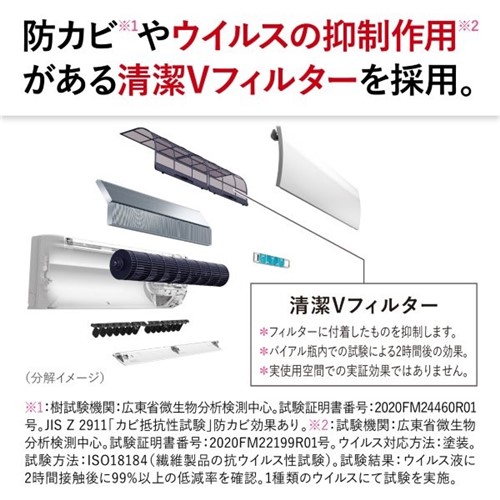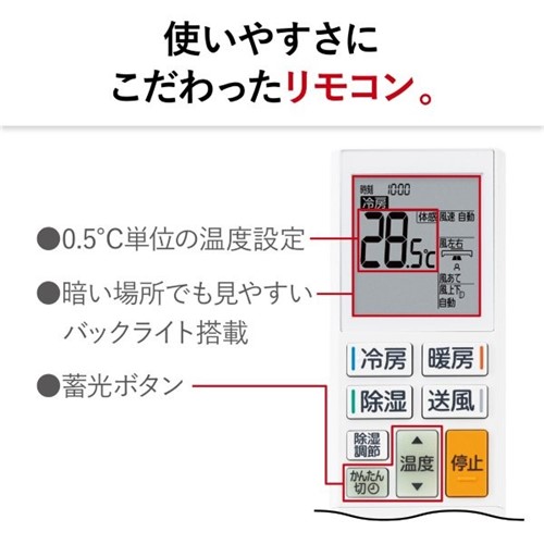 「よごれんボディ」ファンにホコリ汚れと油汚れを同時に防ぐ独自コーティングを施し、カビの原因になるホコリなどの付着を防ぎます。「おまかせボディ」冷房時に発生した結露水による自動洗浄のあと、運転停止後に熱で乾燥させることでカビを抑制します。「はずせるボディ」前面パネルやフラップを外すことができ、エアコンの内部を簡単にお手入れできます。