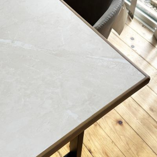 天板と脚を組み合わせて選べる、カスタマイズできるダイニングテーブルです。天然木の縁と大理石調天板の組み合わせが、空間を上品にまとめます。