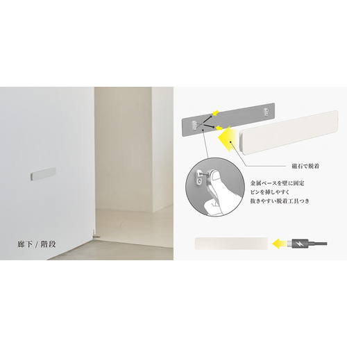 石膏ボードピンで固定するため壁も傷つきにくく、簡単に設置することが可能。本体は磁石で脱着可能。充電時もサッと取り外すことができます。