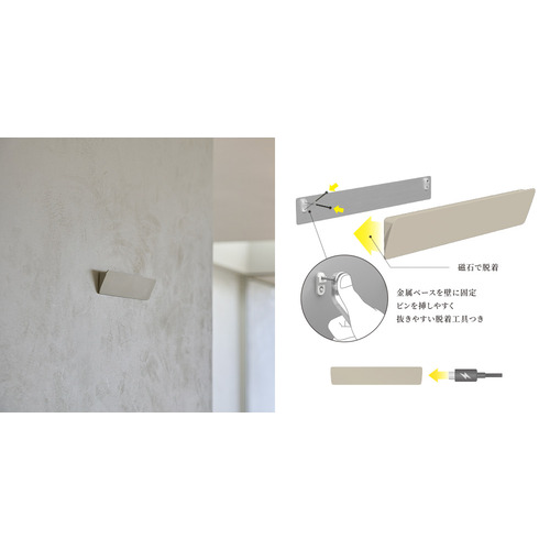 石膏ボードピンで固定するため壁も傷つきにくく、簡単に設置することが可能。本体は磁石で脱着可能。充電時もサッと取り外すことができます。
