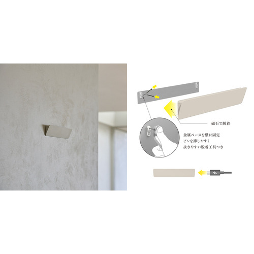 石膏ボードピンで固定するため壁も傷つきにくく、簡単に設置することが可能。本体は磁石で脱着可能。充電時もサッと取り外すことができます。