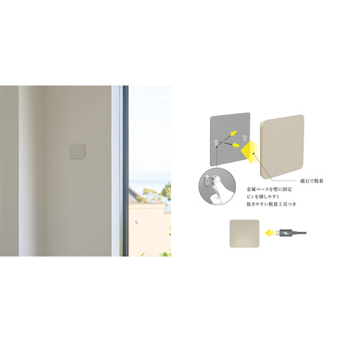 石膏ボードピンで固定するため壁も傷つきにくく、簡単に設置することが可能。本体は磁石で脱着可能。充電時もサッと取り外すことができます。