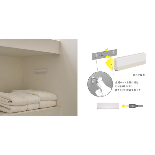 石膏ボードピンで固定するため壁も傷つきにくく、簡単に設置することが可能。本体は磁石で脱着可能。充電時もサッと取り外すことができます。