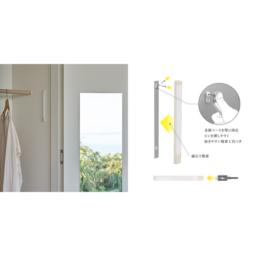 石膏ボードピンで固定するため壁も傷つきにくく、簡単に設置することが可能。本体は磁石で脱着可能。充電時もサッと取り外すことができます。