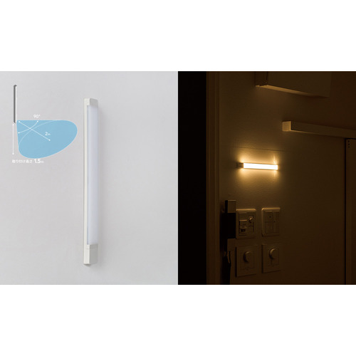 器具感からの脱却、壁面との同化する異物感のない美しい形状。配光・色温度・演色性をつきつめ、従来のセンサーライトにはない陰影を活かす美しい「あかり」を実現。