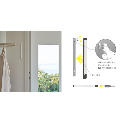 石膏ボードピンで固定するため壁も傷つきにくく、簡単に設置することが可能。本体は磁石で脱着可能。充電時もサッと取り外すことができます。