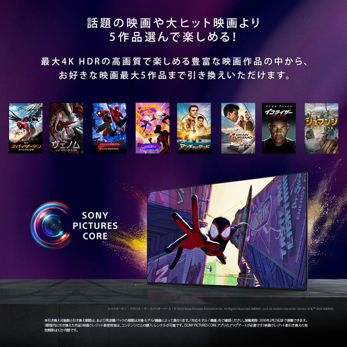ソニー独自のコンテンツサービス「SONY PICTURES CORE(ソニー・ピクチャーズコア)」は、最新映画や大ヒット映画を、最高画質のストリーミングと臨場感あふれる音質でコンテンツを楽しむことができます。