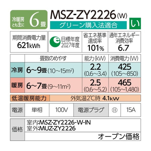三菱電機 エアコン 6畳 霧ヶ峰ZYシリーズ ムーブアイ お掃除簡単 さらっと除湿冷房 MSZ-ZY2226-W ホワイト系 2026年モデル
