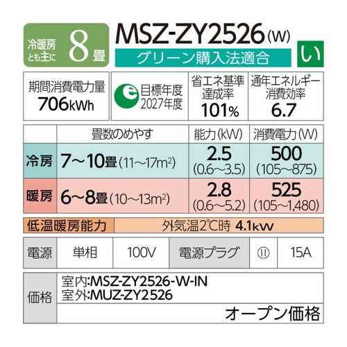 三菱電機 エアコン 8畳 霧ヶ峰ZYシリーズ ムーブアイ お掃除簡単 さらっと除湿冷房 MSZ-ZY2526-W ホワイト系 2026年モデル