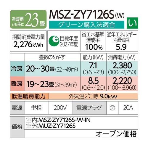 能力:【冷房】7.1(0.6〜7.3)KW【暖房】8.5(0.6〜12.0)KW