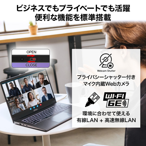 ビデオ通話・会議に重宝するマイク内蔵Webカメラ(プライバシーシャッター付き)に加え、高速無線LAN「Wi-Fi 6E」や有線LANなど便利な機能を標準搭載。