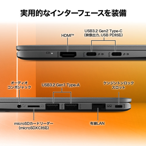 映像出力やUSB PDにも対応したUSB3.2 Gen2 Type-Cポートをはじめ、HDMIや有線LAN、microSDカードリーダーなど実用的なインターフェースを標準装備。