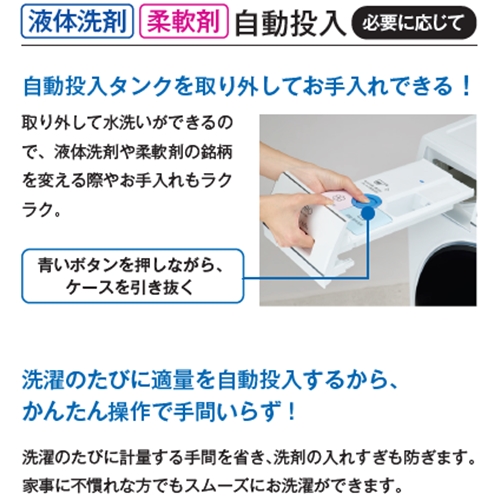 液体洗剤/柔軟剤自動投入で手間を省きます。自動投入タンクは取り外してお手入れもラクラクです。