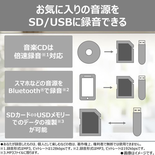 ●クロスメディア機能により、Bluetooth音源、CD、ラジオ、外部入力音源、内臓マイク音源をSDカード/USBメモリに録音可能