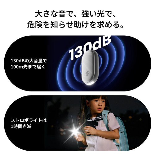 いざという時は、「探す」アプリから、子どもの「今どこ?」「危ない!」がすぐ分かります。不審者に遭遇したら、迷わずピンを抜きましょう。130dB(100m先まで聞こえるレベル)の大音量でブザーが鳴り、警報ライトが高速で点滅します。周りの大人に危険を知らせて、犯人を撃退しましょう。また、Appleの「探す」から、日本全国どこでも、お子さまの携帯品の位置をいつでも確認することができます。
