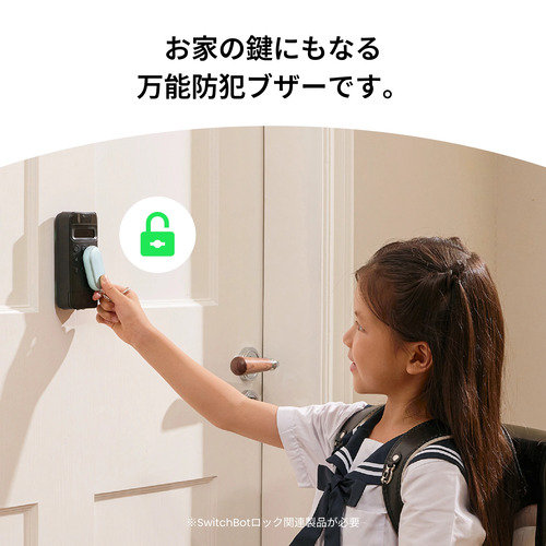 SwitchBot 防犯ブザーは、キーパッドや指紋認証パッド、顔認証パッド、テレビドアホンの鍵にもなります。お子さまに鍵を持たせて、「無くしたらどうしよう」と心配する必要なし。学校から帰宅する際には、防犯ブザーをパッドに近づけるだけでドアを開けられます。