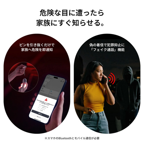 「誰かにつけられてるかも・・・」と不安になった時、まずはフェイク通話で様子見。防犯ブザーのボタンをダブルクリックすると、「誰かから電話がかかってきたように見せかける」ことができます。マナーモードでもしっかり着信音が鳴り、犯罪抑止効果に。また、危険に遭遇した時は、防犯ブザーを作動させると、スマホ(Bluetoothとモバイルデータ通信がONになっている必要あり)から、予め指定した緊急連絡先へ通知を送信し、危険を知らせます。