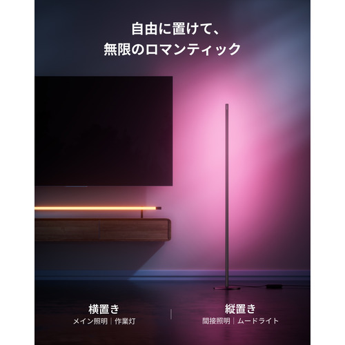 SwitchBotフロアライトは、スリムなフォルムのバーライトで狭いコーナーや隙間にもすっきり収まるサイズ感。例えば、寝室のベッドサイドへ横向きに設置すれば、就寝前の入眠タイムを優しい光で包み込み、読書灯としても◎。観葉植物の傍らに置けば、間接照明として空間に彩りを添えます。また、アプリで光の色や明るさを調節可能。夕食時は暖色の灯りでロマンチックな雰囲気を、仕事中は自然光に近い灯りで集中力を高めるなど、シーンに合わせて自由自在にコントロールしましょう。あなたのライフスタイルに寄り添う、スマートでスタイリッシュなフロアランプです。