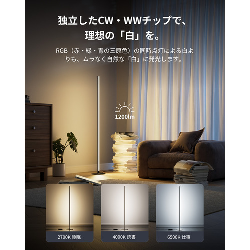 SwitchBotフロアライトは、3つのチップに1つのダイオードが含まれた「RGB・昼光色(CW)・電球色(WW)」LEDライトを採用し、最大1200lmの明るさで、やさしい白からカラフルな光まで、自然な発光で空間を美しく照らします。例えば、リラックスしたい時はオレンジ色の柔らかな光を、お子さまの学習時には目に優しい自然光モードで集中力を高める環境を作り出します。1600万色のカラーバリエーションと1%単位の調光で、色温度は2700〜6500Kを無段階で調節可能。読書の時は柔らかな間接照明に、映画鑑賞時はムーディーなバックライトに。1台で多彩なシーンに対応します。誰でもスマホから簡単に操作できるのも魅力です。