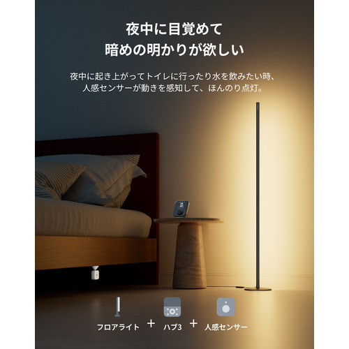 (1)人感センサーと連動(ハブ必要):夜中に起き上がってトイレに行ったり水を飲みたい時、人感センサーが動きを感知して、うっすら点灯。ベッドに戻ったら自動で消灯し、節電にも◎。 (2)テープライトと連動:空間を包み込むようなダイナミックな演出で、パーティーや特別な日の雰囲気作りに。 (3)リモートボタン&学習リモコンから操作:一戸建ての広い空間などで、従来の赤外線リモコンでは届かなかった場所からでも、フロアライトを操作できます。 (4)ロックUltra&開閉センサーと連動(ハブ必要):ドアを開けるとライトが自動点灯。ロックが閉まると家電をまるごとOFF。 (5)屋外カメラと連動:不審者を検知すると自動で点灯し、同時に警報を鳴らして不審者を威嚇。犯罪抑止力に。
