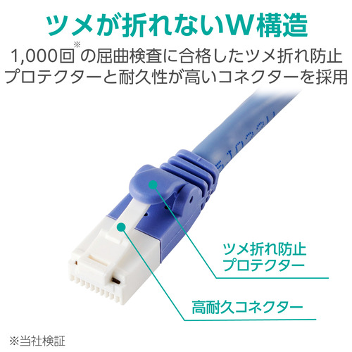 ●ツメ折れ防止プロテクターと屈曲に対する耐久性が高い素材のコネクターを採用したダブル構造で、ツメが折れにくいLANケーブルです。 ※1000回の屈曲検査に合格(当社検証)