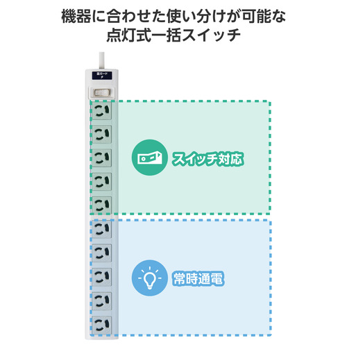 ●電源状態が一目でわかる点灯式一括スイッチを備えています。10口のうちコード側の5口はスイッチによるON/OFFができ、残り5口は常時通電するので、使用機器に合わせた差込口の使い分けが可能です。