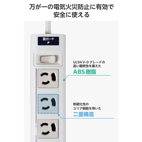 ●本体筐体にはUL94 V-0グレードの高い難燃性を備えたABS樹脂、差込口周りには熱硬化性のユリア樹脂を用いた構造で、万が一の電気火災防止に有効です。