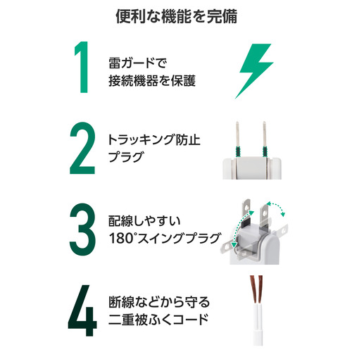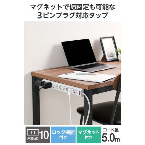 ●プロジェクターやモニターなどの3ピンプラグ機器を、アダプターなしで接続できる3ピンプラグ対応タップです。抜け止め機能付きの差込口を10口備え、設置に便利な仮固定用マグネット、狭い場所でも配線しやすい2ピンのスイングプラグ、点灯式一括スイッチ(※)、設置に便利な仮固定用マグネットを搭載。雷ガード機能と丈夫なキャブタイヤコードにより、安全に使用できます。※コード側5口のみ連動