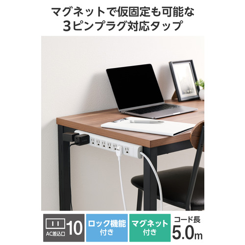 ●プロジェクターやモニターなどの3ピンプラグ機器を、アダプターなしで接続できる3ピンプラグ対応タップです。抜け止め機能付きの差込口を10口備え、設置に便利な仮固定用マグネットを搭載。雷ガード機能と丈夫なキャブタイヤコードにより、安全に使用できます。3ピン-2ピン変換アダプター(アース線付き)が付属しています。