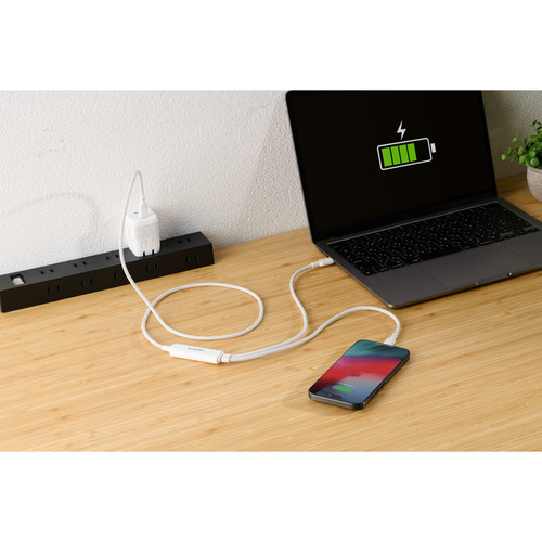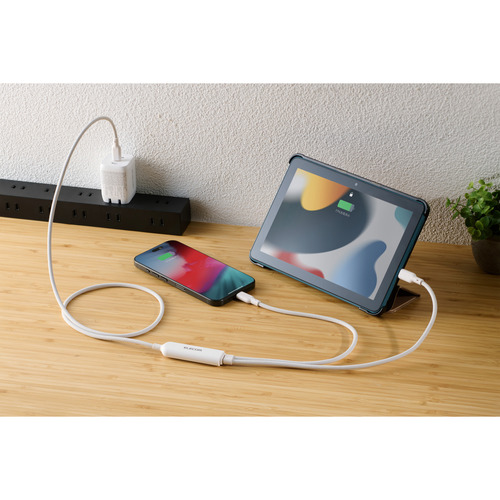 ●ケーブル1本でパソコンやスマートフォンなどの機器を2台同時に充電可能。散らかりがちなケーブルをすっきり配線でき、旅行や出張など外出先への持ち運びも1本に集約できます。