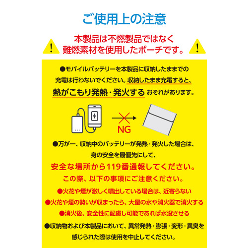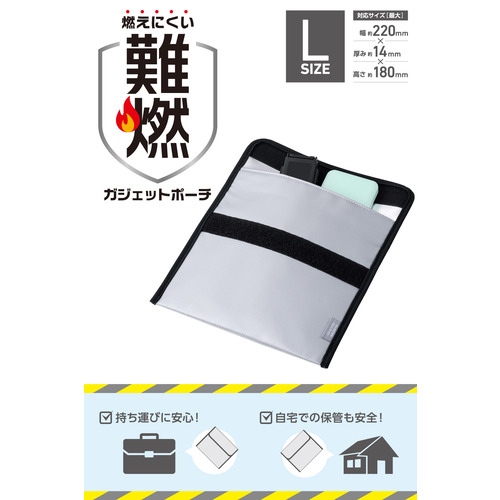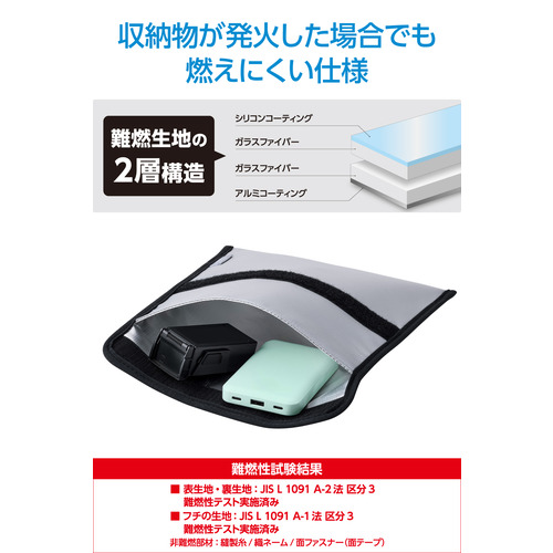 ●いざというときの備えに!燃えにくい素材のガジェットポーチです。難燃性試験をクリアした生地を二重に使い、すき間をしっかり塞ぐ構造を採用。発火したときの延焼や、火・煙の漏れを抑えます。背面ポケットにはケーブルも収納できて便利。大型・複数のモバイルバッテリーなどのガジェット類をまとめて収納可能なサイズです。