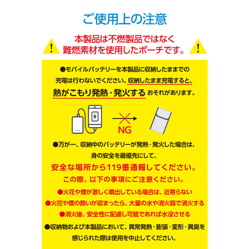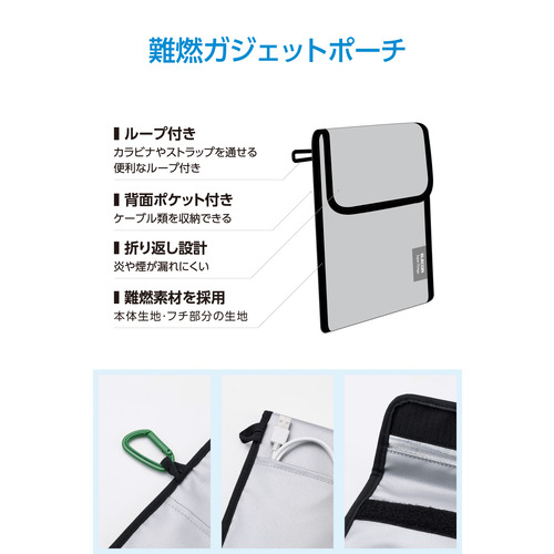 ●いざというときの備えに!燃えにくい素材のガジェットポーチです。難燃性試験をクリアした生地を二重に使い、すき間をしっかり塞ぐ構造を採用。発火したときの延焼や、火・煙の漏れを抑えます。背面ポケットにはケーブルも収納できて便利。飛行機内への持ち込みや持ち運びに便利なサイズです。