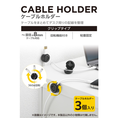 エレコム EKC-CCH01BK ケーブルホルダー 最大径約8mmケーブル対応 360度回転土台 粘着シート付き 3個入り ブラック