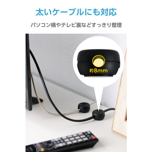 ●最大8mmの太いケーブルにも対応した設計で、スマートフォンの充電ケーブルはもちろん、HDMIやLANケーブルもしっかり固定可能。パソコン横やテレビ裏などで一時的に使っていないケーブルをすっきり整理でき、使いたいときにすぐ取り出せます。