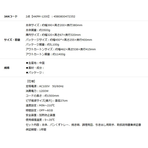ヒロコーポレーション HKPM-1200 ピザトースター お家で本格的なピザを 直径27cmまで対応 ブラック